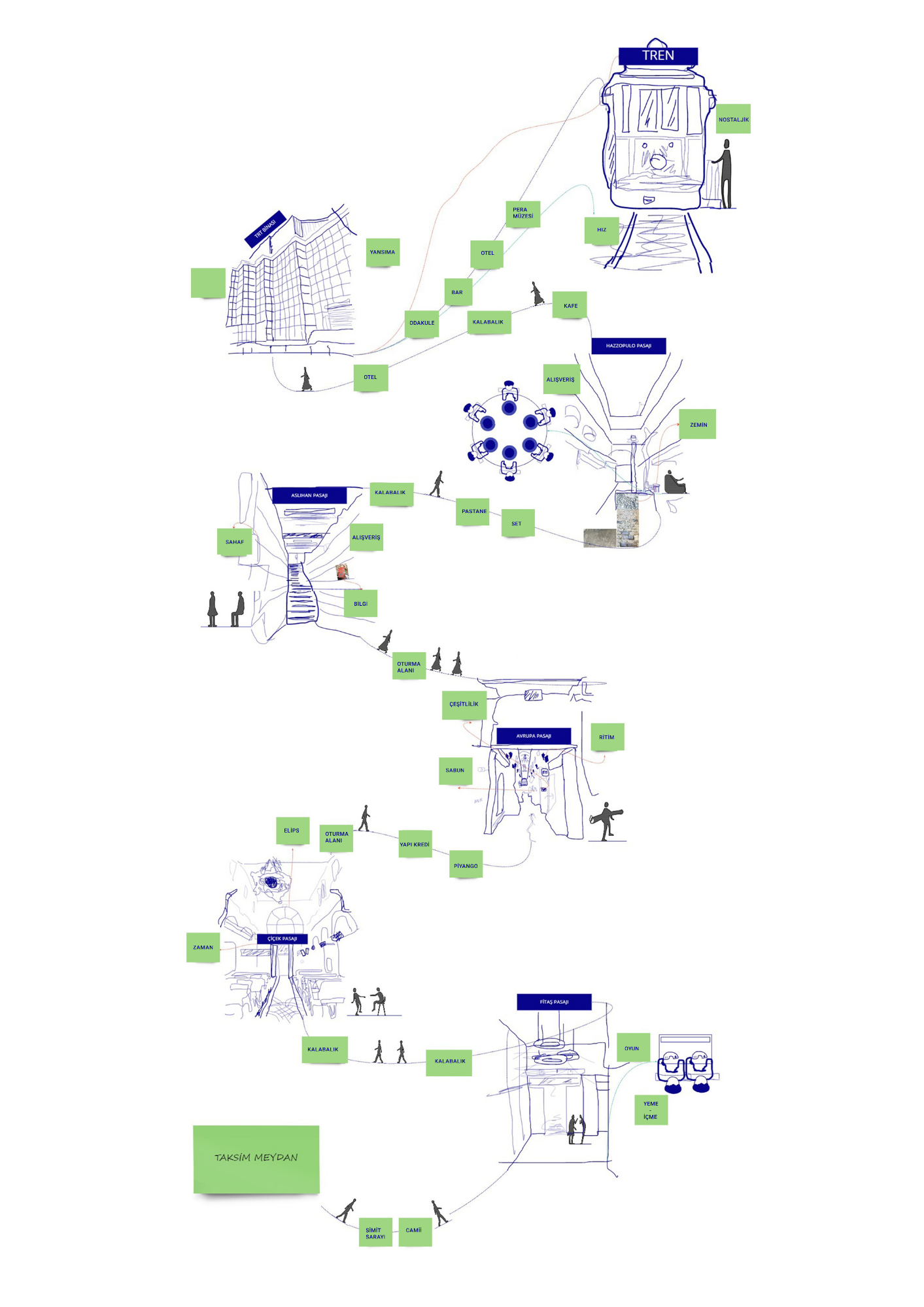 Her geçtiğim sokakta dikkatimi çeken detayları çizdim, fotoğrafladım ya da kelimelerle not aldım. Zamanla mekanlarla kurduğum ilişki derinleşti. Hazzopulo Pasajı gibi bazı alanlarda, tek bir mekanın nasıl iki farklı işleve (alışveriş ve yeme-içme) sahip olabileceğini gözlemledim.
